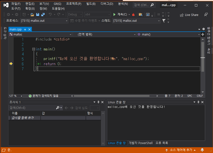 코드를 작성하고 빌드&컴파일을 해보시면 잘 실행되는 것을 확인할 수 있습니다.