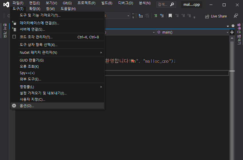 설치가 완료되면 Visual Studio를 실행한 후 [메뉴] -> [도구] -> [옵션 클릭]