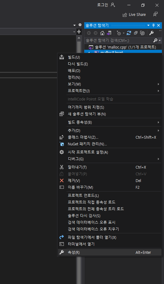 [솔루션탐색기] -> [프로젝트 우클릭] -> [속성]