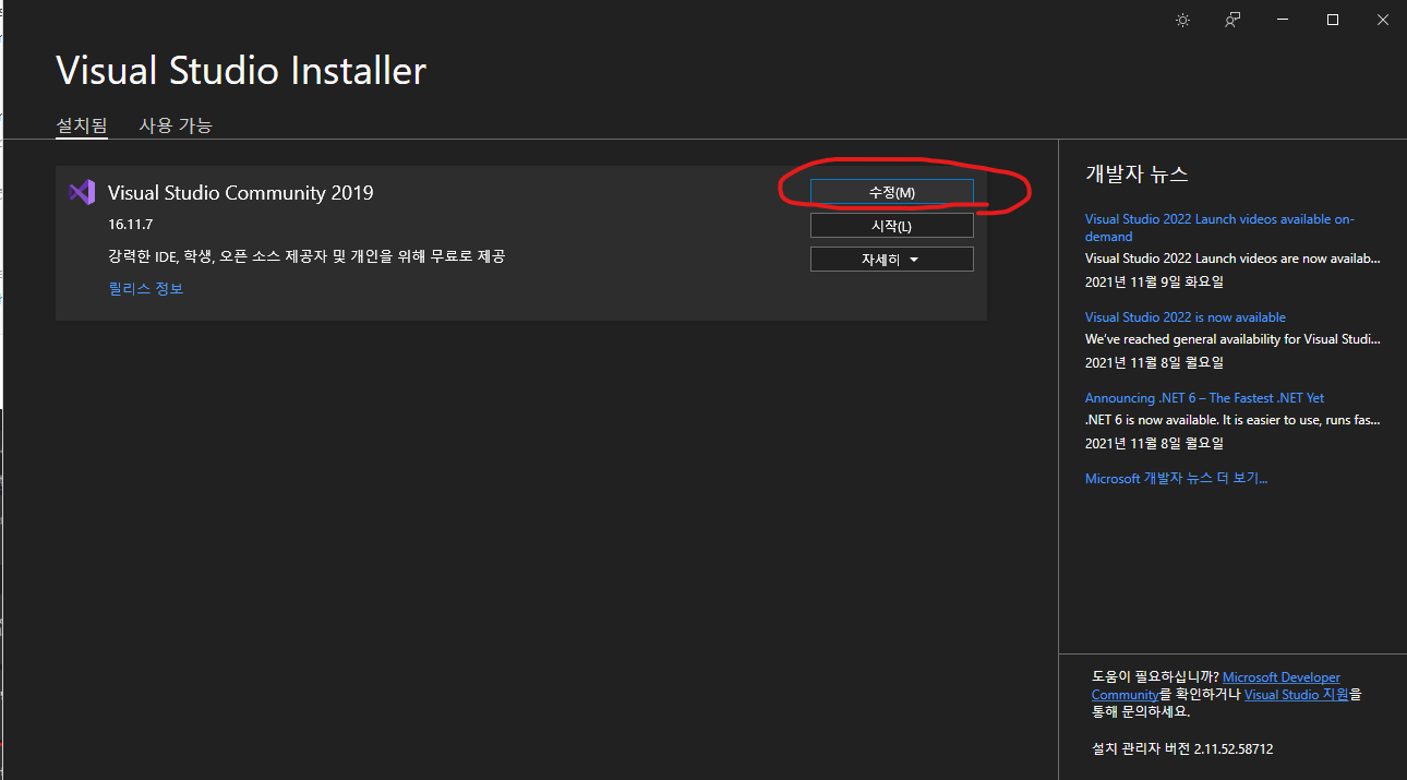 위 설정이 완료되면 Visual Studio Installer를 실행시킵니다.