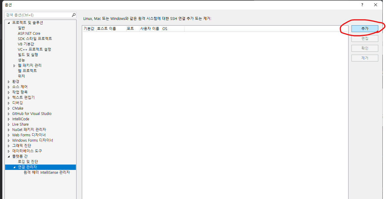 [플렛폼 간] -> [연결 관리자] -> [추가]