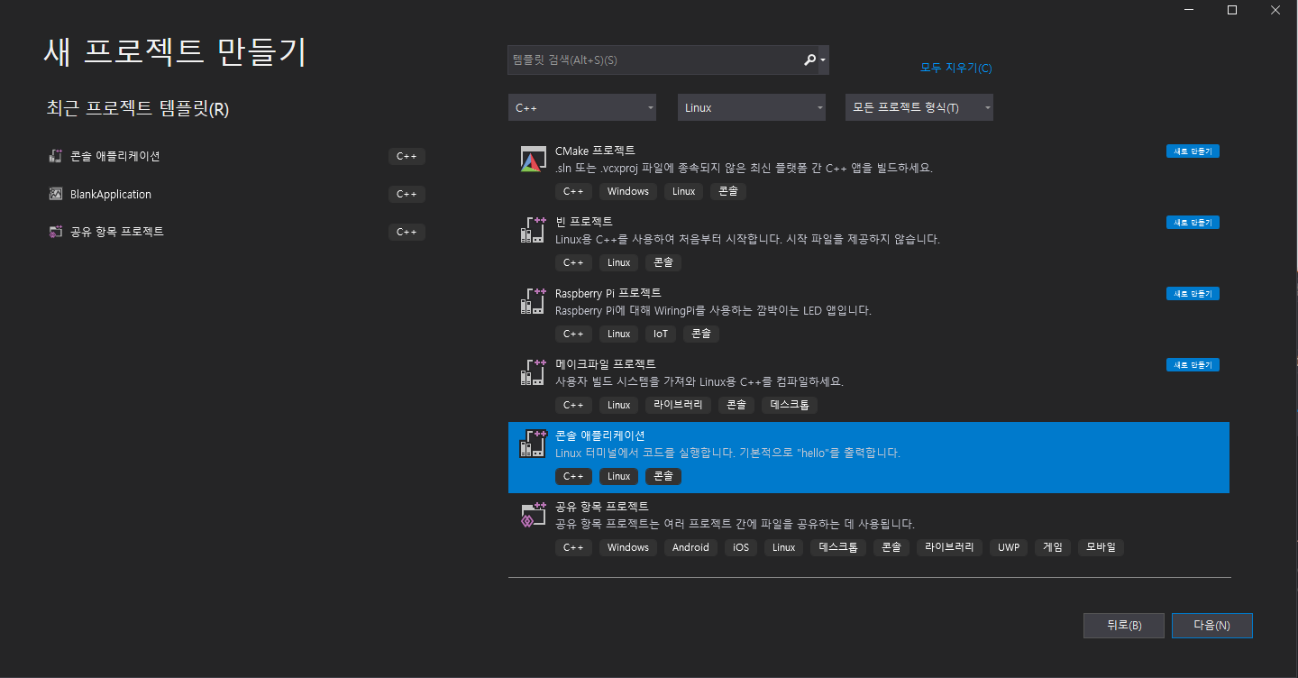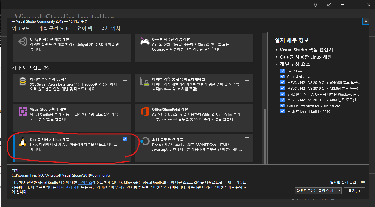 C++ 를 사용한 Linux 개발 항목을 선택하여 설치합니다.