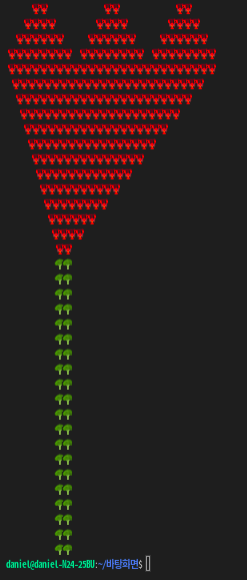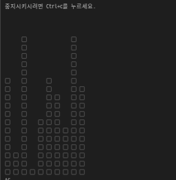 #include #include #include int main(void) { int i, j, k, l; int num = 10; system("clear"); for (l = 0; l < 20; l++) { //---------------------------------------모래시계 printf("\n\n"); for (i = 1; i < num / 2; i++) { printf(" "); for (j = 0; j < i; j++) { printf(" "); } for (k = 0; k < (num - 2 * i - 1); k++) { printf("* "); } for (j = 0; j < i; j++) { printf(" "); } printf("\n\n"); } for (i = 1; i <..